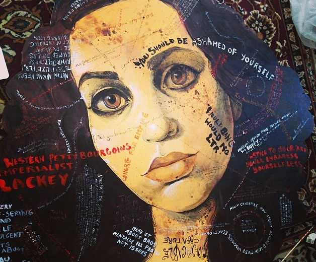 It’s clear then, that a woman such as this is not qualified to be considered a journalist, much less a “leftist” by any serious standards. She is simply a pop-culture propagandist, marketed to young leftists as an acceptable and attractive alternative to Thomas Friedman. Yet, when confronted with criticism on her position or credentials, Crabapple retreats into a victim’s shell. Her critics are “haters”, “jealous”, or “obsessed with her [sexually]”. Refugee Palestinian children become her sexual molesters while she simultaneously and bravely calls for their betterment – not through BDS or armed resistance, but *some*how. Likewise, the “left” pelts her with alleged rape threats while she is only trying to help them win broader exposure. Her sexuality as a woman simultaneously promotes and shields her. She even went as far as to paint a portrait of herself with various criticisms painted over her face – few of them were threats to her body, most of them to her politics, but certainly all one and the same in her artistic representation.